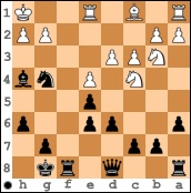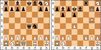 So spielte er in der 5. Runde mit Schwarz gegen einen Gegner, der über 130 DWZ-Punkten mehr vorzuweisen hatte. In der linken Diagrammstellung - man sieht schon an der Stellung, welche Fortschritte des Schachverständnisses das Alter und die Erfahrung mit sich bringt - zog der Gegner unbedacht 12. Sb3, was Tommy eiskalt auszunutzen wusste.