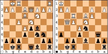Erst als er in der rechten Diagrammstellung durch 19. Dxe7+ auch seine letzte Schwerfigur verlor, gab er sich geschlagen und Jelena konnte ihren 2. Punkt verbuchen.
