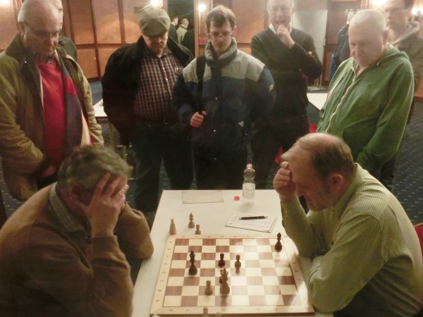 Das erste Remis holte Walter Heil nach ca. 2½ Stunden und er konnte das beruhigt tun: Mindestens die Mittelbretter 4+5 sowie der Mannschaftsführer Günter Horny standen klar besser, während an den anderen Brettern nur wenig Ungemach zu sehen war.