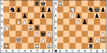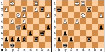 Nur wenig später hatte der Bad Nauheimer Gegner an Brett 4 in der linken Diagrammstellung mittels 1. g4?? für akute Felderarmut bei der eigenen Dame gesorgt. Dies nutzte Günter umgehend mittels 1. ... g6 aus und weitere 8 Züge später wollte sich der Gegner das finale Mattbild nicht mehr zeigen lassen.