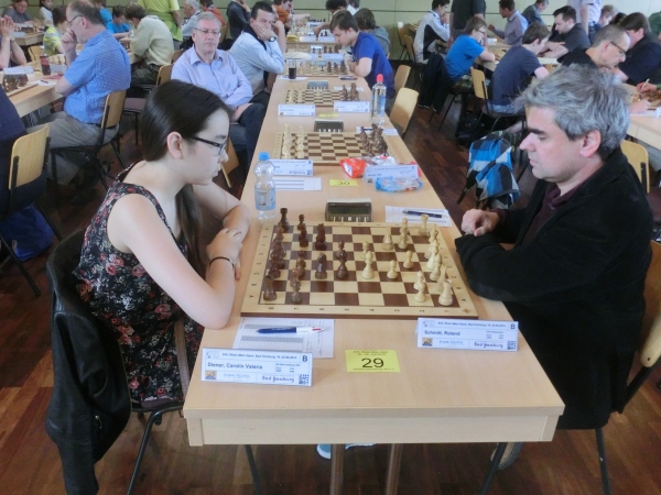 In der B-Gruppe sind dagegen 6 Spieler mit 3½ Punkten an der Front. Eine davon ist Carolin Diener, die sich mit Roland Schmitt ein Italienisches Theorieduell lieferte.
