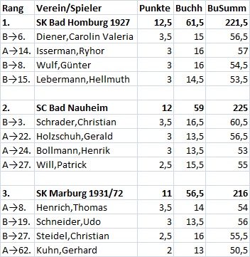 Spannung auch in der Mannschaftswertung: Hier führt derzeit der Gastgeber Bad Homburg knapp vor Bad Nauheim. Aber in der 5. Runde treffen mit Isserman-Holzschuh und Will-Lenz gleich zwei Pärchen von Protagonisten aufeinander.