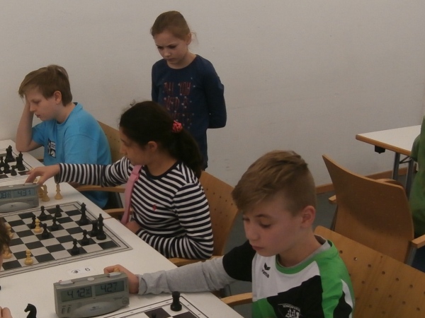 Damit holte sie einen wichtigen Punkt im Rennen um die Pokale. Da sie die beste Buchholzwertung aller teilnehmenden Mädchen angesammelt hat, kann sie nun in der Schlußrunde noch in den Kampf um die Pokale eingreifen wenn eine der 3 vor ihr liegenden Spielerinnen verlieren und sie gewinnen sollte.