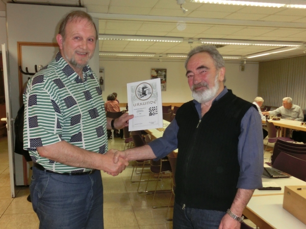 Turnierleiter Paul Lenhart überreicht dem Sieger Ryhor Isserman die Urkunde.