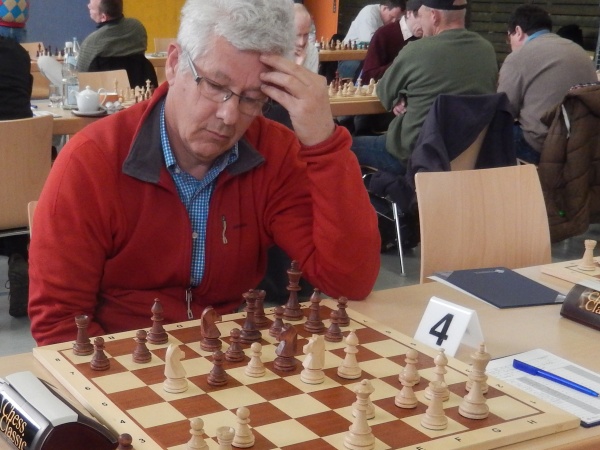 Richard Kaiser hatte nach einem Bauerneinsteller einen zähen Kampf ums Remis vor sich - und (wieder einmal) sollte er es schaffen: Er hielt am Ende das Endspiel mit ungleichen Läufern und zwei Minusbauern.