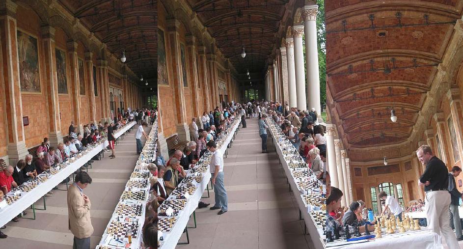Matthias Siegmann und ich (= Frank Hoffmann) waren am Samstag in Baden-Baden zum jährlichen Mannschaftssimultan der Bundesligamannschaft OSC Baden Baden. Mit einer Rekordbeteiligung von 133 Teilnehmern wurde das Simultan in der ansprechenden Trinkhalle im Kurpark ausgerichtet. Mit u.a. Anand, Bacrot, Naiditsch und Rustem Dautov hat der Bundesligaclub recht attraktive Spieler für eine Teilnahme gewinnen können.