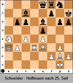 In der Diagrammstellung rechts reifte die Entscheidung heran. Schwarz muss den Bauern auf b6 decken, aber sowohl 25. ... b5? 26. Lc5! als auch 25. ... c5? 26. Sxc5! scheitern an der schlechten Position des Tf8. Einzig 25. ... Da8! hält das Spiel in der Remisbreite. Aber es folgte 25. ... Db8? 26. Sxb6! und weil nun der Konter 26. ... Td8! 27. Txd8 Dxd8 28. Sa4 Dd1+ 29. Lf1 Lh3 wegen des möglichen 30. Dc1 Db3 31. Sc5 nichts einbringt, verblieb Wolfram Schneider mit einem Mehrbauern, denn er nach 42 Zügen sicher verwertete.