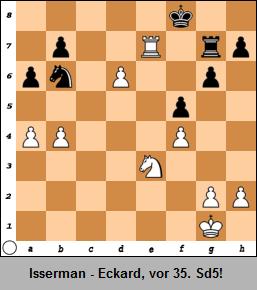 Aber es wurde doch noch einmal spannend: Ingo Hanemann wollte trotz soliden Mehrbauern das Endspiel vermeiden - und geriet mit Abseits stehender Dame in einen tödlichen Mattangriff. Auch bei Richard Kaiser verdunkelte sich das Bild immer mehr, so dass der Sieg von Mannschaftsführer Volker Novak nach strategisch überlegenem Spiel am Damenflügel schon nötig war, um nicht zu viel Spannung aufkommen zu lassen. Nach einem Remis von Walter Schmidt gelang Ryhor Isserman der Big Point: In nebenstehender Stellung zog er 35. Sd5!, worauf Schwarz nach 35. ... Sxd5 36. Txg7 den Bauern durchlaufen ließ.