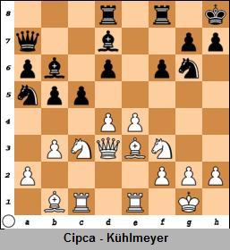 Adrian Cipca kam sehr gut aus der Eröffnung heraus und erspielte sich eine druckvolle Stellung, obwohl Manfred Kühlmeyer seine spanische Spezialvariante anstrebte. Im Bestreben, weiter möglichst aktiv zu spielen überzog er aber in der Diagrammstellung mit 1. h4 Tfe8 2. e5? cxd4! deutlich - danach hatte Manfred Kühlmeyer keine Mühe mehr, sich ausreichend zu verteidigen und den Punkt einzusacken. Wie die Analyse zeigt, hätte 1. Sd5 zum Erhalt des Vorteils gereicht. Manfred Kühlmeyer trifft nun auf den Mannschaftsführer der ersten Mannschaft, Volker Novak.