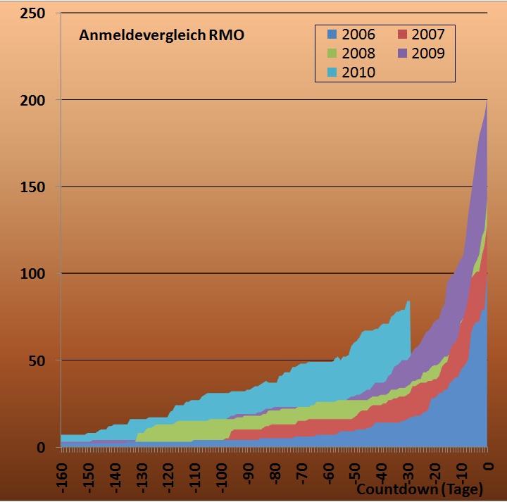 So rasch füllten sich die Anmeldelisten noch nie. Hellblau die Statistik in Abhängigkeit vom Countdown in Tagen. Jetzt sind es noch deren 29!.