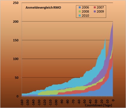 Das hat sich gründlich geändert, wie man an nebenstehender Grafik erkennt: Im Schnitt kommen in den letzten Tagen ein Dutzend Anmeldungen herein. Das Feld wird voll! Und zwar wesentlich schneller als je zuvor - das ist ein schönes Lob für die Organisatoren!