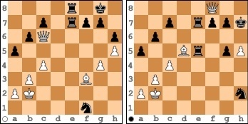 Viel länger kämpften Mussler und Hellmuth Lebermann um den Einzug ins Viertelfinale. Mit Weiß hatte Ersterer, der Mannschaftsführer der 2. Mannschaft, die Stellung ungenau behandelt und steht im ersten Diagramm schon schlechter. Er setzte mit 1. g5 hxg5 2. Db5 alles auf die Karte Angriff - und wurde belohnt, als Hellmuth Lebermann mit 2. ... Te5? 3. Dd7 Sh2 4. Ld5 fortsetzte und Weiß in das Hinterland eindringen konnte. Es folgte die rechte Diagrammstellung, in der das Leben von Schwarz schon schwierig ist. Ca. 1 Stunde später hatte Weiß dann auch souverän gewonnen.