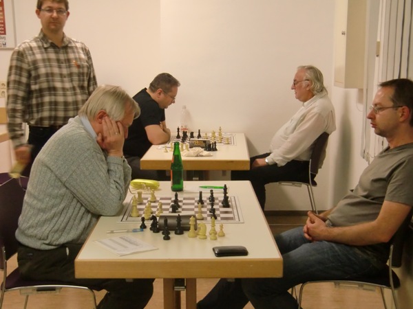 Adrian Cipca (hinten links) vor der vermeintlich siegbringenden Kombination. Er ahnte noch nicht, welches Schicksal der Abend für ihn bereithalten würde. Vorne spielen Otto Reimer und Egon Merkle remis.