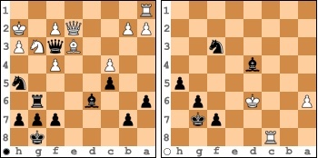 Die tragische Figur des Abends gab Adrian Cipca ab. Er hatte schon in der Auftaktrunde in einer (überraschend entstandenen) Gewinnstellung aufgegeben. Dieses Mal überspielte er den erfahrenen Hellmuth Lebermann im Mittelspiel glatt: In der linken Diagrammstellung gewann er nach besserer Mittelspielbehandlung verdient entscheidendes Material: 30. ... Txg3! 31. Dxf3 Txf3 32. Kg2 Txf4!.