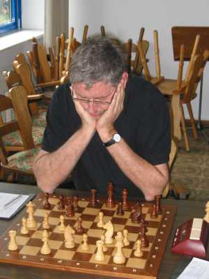 Tatsächlich ging jedoch die gesamte Mannschaftskalkulation in der Brettbesetzung weitestgehend auf: Bad Vilbel trat fast genauso an, wie vorausberechnet. Ein gutes Omen, denn obwohl der zum zweiten Einsatz gekommene Michael Hovan erneut bereits nach einer Stunde eine verlorene Stellung auf dem Brett hatte und die Mannschaft frühzeitig mit 0:1 in Rückstand geriet, konnte Günter Horny mit einem klugen taktischen Remis einen halben Punkt auf die Haben-Seite bringen. Der an Brett 1 spielende Hellmuth Lebermann, der sich einmal mehr wacker zu schlagen versuchte, war er jedoch gegen FM Schmitzer kalkuliert chancenlos.