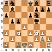 Nach einer Gesamtspielzeit von 1½ Stunden ergab sich dann das erste Spielresultat am letzten Brett. Der Gegner von Wolfgang Hettler schickte sich an, dessen Sf3 zu erobern, als dieser in der Diagrammstellung mit 10. Sh4 sowohl die gegnerische Df5 angriff, als auch mit seinem auf g2 postierten Läufer seinen schwarzen Gegenüber Lb7 befragte. Nach der sich eröffnenden Situation drohte mindestens der Totalverlust des Lb7, wenn die Dame gerettet werden sollte. Der Gegner entschied sich jedoch dafür die Dame einzustellen und sich dafür an LxLg2 und LxTh1 schadlos zu halten.