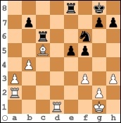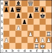 Somit stand es dann zunächst erst einmal 1½:½ für die Gastgeber, bis nach einer Gesamtspielzeit von knapp drei Stunden sich die Zeichen bei Frank Hoffmann lichteten und dieser einen Sieg über seinen 150 DWZ-Punkte stärkeren Gegenspieler vermelden und damit das Gesamtergebnis zunächst ausgleichen konnte. In der Diagrammstellung links gewann Frank Hoffmann nämlich eine Figur, als Schwarz 25. ... Sd6 zog und dabei 26. Txf8+ Lxf8 27. Df3! nicht in Betracht gezogen hatte.