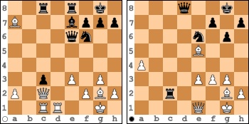 Die Entscheidung fiel nach weiteren Fehlern kurz vor der Zeitkontrolle im rechten Diagramm: 38. ... Dc8 39. Lf1 Sg5 40. Dd1 Td2 erzwang die Aufgabe von Weiß.