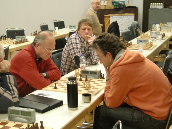 Der Ausgleich lag nun nahe, denn P. Dertscheny verwertete seine weit überlegene Stellung ganz sicher. Und am Schluss verblieb noch die Hoffnung auf einen Sieg, denn Manfred Kroth mühte sich mit einer Mehrfigur, die aus dem Zeitnotgemetzel übrig geblieben war, ab. Aber nach 77 Zügen musste er kurz vor 19:30 Uhr einsehen, dass die Partie nicht zu gewinnen sein wird. 4:4 - ein gerechtes Unentschieden. (W.S.)