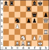 Ramat Faqiry ging viel zu ungestüm auf seinen Gegner Manfred Kroth los und schon nach wenigen Zügen (und wenigen Minuten!) hatte dieser das Angriffsspiel widerlegt. In der Diagrammstellung brach er im Zentrum mit 14. ... c5! durch und nach 15. Tfe1 cxd4 16. Sxd4 Dc5 17. Db2 Se5 war die Partie bereits entschieden. Eine harte Niederlage für den Pokalfinalisten.