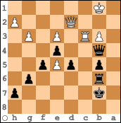 Mit Schwarz hatte Ramat Faqiry zwar zunächst die Oberhand erhalten, ließ dann aber bei knapp werdender Zeit mehrere Gewinnchancen aus. In der Diagrammstellung stellte zuletzt 1. Db2-d2 böse Drohungen auf, aber hier vergab Faqiry letztmalig seine Chance: Statt dem gewinnbringenden 1. ... Tc6 folgte 1. ... De7 2. Dxd5+ und Weiß setzte bald matt.