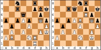 Noch Besseres gelang allerdings Paul Lenhart, der mit einem doppelten Qualitätsopfer über den Hessenligisten Richard Kaiser siegreich blieb. Und zwar trumpfte er zunächst in der linken Diagrammstellung mit 26. Tf6 Lxf6 27. Txf6 Dd7+ 28. Kg2 Sd6 auf, um dann gleich noch die zweite Qualität anzubieten: 29. Lxe5 Se8 (2. Diagramm) 30. Sf4! - und gewinnt hübsch!