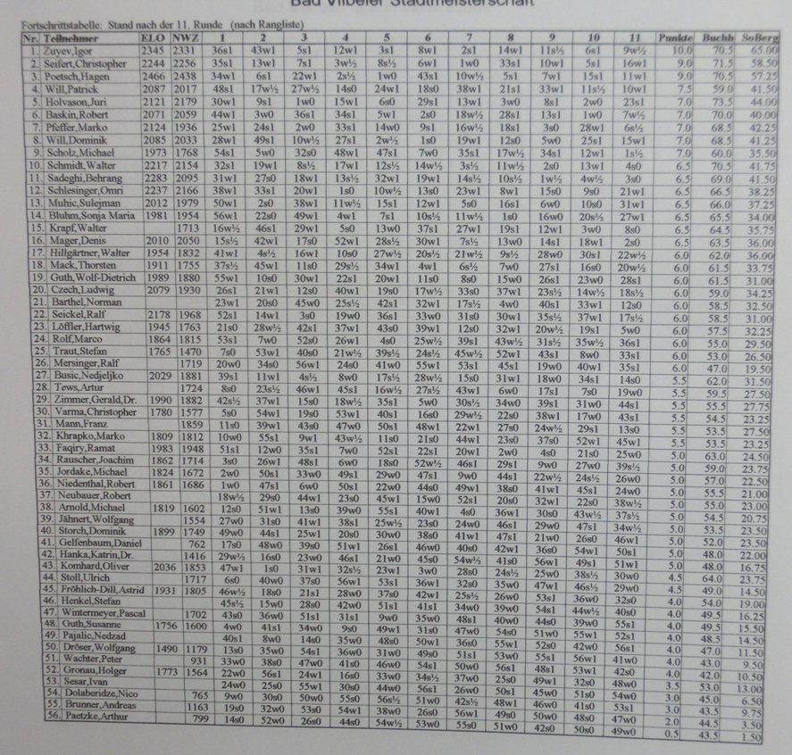 Die Offene Bad Vilbeler Stadtmeisterschaft litt in diesem Jahr erheblich unter der gleichzeitig stattfindenden Oberliga und Zweitliga-Runde. So fanden - trotz verregnetem Schachwetter - nur 56 Spieler den Weg ins Vilbeler Kurhaus (Vorjahr: 86, darunter 19 Titelträger!) und auch die Spitze war schnell ausgemacht: IM Hagen Poetsch (Wiesbaden, 1. Bundesliga) und FM Igor Zuyev (Heusenstamm, Hessenliga) waren die einzigen Titelträger.