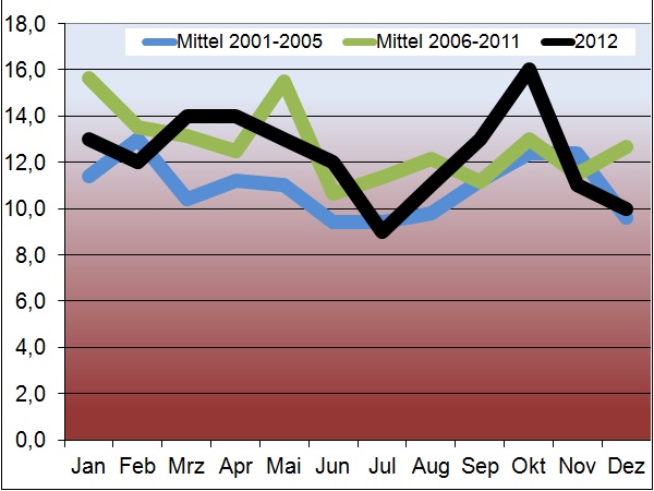 Teilnehmerstatistik der Blitzturniere: 2012 nahemn insgesamt 36 verschiedene Spieler an den 12 Turnieren teil (Vorjahr 34), pro Turnier waren es im Schnitt 12,3 Spieler (12,8). Es wurden insgesamt 859 Partien ausgetragen (924). Insgesamt ist der Trend also marginal rückläufig, bewegt sich aber immer noch auf hohem Niveau, wie ein Blick auf andere Vereine zeigt.
