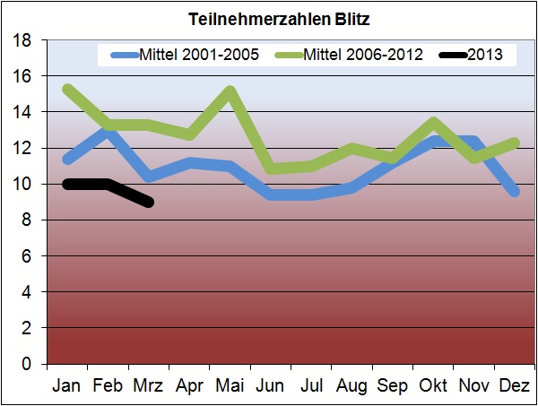In 2013 bisher weit unter dem Durchschnitt: Teilnehmerzahlen am monatlichen Blitzturnier.