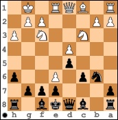 Schön früh musste nämlich Peter Dertscheny den Schlag 11. e6! (siehe Diagramm) hinnehmen und das sah gar nicht gut aus. Der nervenstarke Kurstädter entschloss sich zu 11. ... Lxe6 12. Txe6 fxe6 13. Se5 g6, hätte aber nach 14. Dg4! wohl bald die Segel gestrichen. Aber Weiß fand diesen Gewinn nicht und zog schwach 14. Dc2? Tg8, wonach Schwarz immerhin noch lebte.
