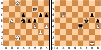 Im linken Diagramm, schon nach Mitternacht, hatte Manfred Kroth die Stellung praktisch überzogen: 53. Se3!! scheint für Weiß (!) zu gewinnen, weil der Springer wegen 54. b6 unantastbar ist und auch 53. ... Sb4 54. b6 e4 55. b7 Sa6 56. Sd5 nebst Sb4 verliert.