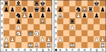 Im linken Diagramm opferte Walter Schmidt die Qualität: 16. 0-0-0 Sd4 17. Sxd4 cxd4 18. Txd4 Lxd4 19. Dxd4 und bekam die erwartete Kompensation in Läuferpaar und Freibauer - mehr aber auch nicht.