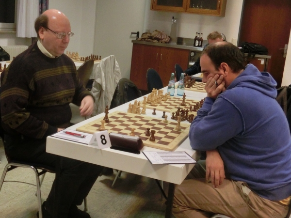 Die Schluss-Szene des langen Kampfes: Peter Dertscheny (links) ist jetzt obenauf und er weiß, dass sein Bb3 durchlaufen wird.
