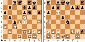 Es begann mit zwei Paukenschlägen: Schon nach einer Stunde nahm Ingo Hanemann einen Zentral-Bauern aus der gegnerischen Stellung (linkes Diagramm: 16. ... Sxe4!), für den sein Gegner nur spärliche Kompensation bekam. Sollte eine Sache der Technik sein, so die einhellige Meinung.