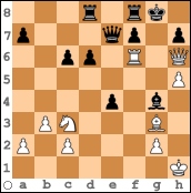 Die Diagrammstellung ist brandgefährlich und beiden Kontrahenten war das bewusst. Nach 21. Lh4 De5! hatte Richard Kaiser mit Weiß ursprünglich die hübsche Fortsetzung 22. Tf5 Dxf5 23. Lf6 geplant, musste aber jetzt erkennen, dass dann 23. ... Dxh5+ (Schach!) die Partie wegwerfen würde.