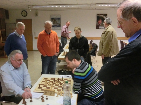 Hellmuth Lebermann (links) kämpfte bis zum Schluss - noch länger als die Partien in der Hessenliga neben an. Aber am Ende verlor er seine erste Mannschaftspartie seit März 2012. Eine starke Serie!