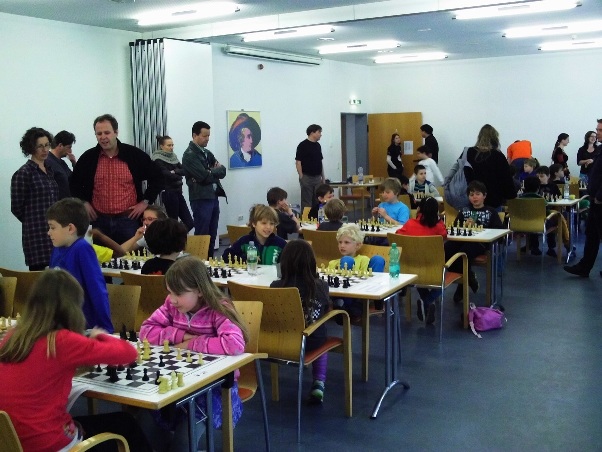 Auch gestern früh hieß es wieder sehr zeitig Wettkampfbereitschaft herzustellen, denn bereits um 8:15 Uhr fragte der Schiedsrichter die Kinder wieder, "Schicken wir die Eltern endlich raus?". Wie ein perfekt einstudierter Chor schallte selbstredend eine vielstimmige Zustimmung durch den Turniersaal. Es ist seit ein paar Jahren bei der Hessenmeisterschaft üblich, dass die Kinder ihre Partien in Ruhe, also ohne argwöhnische Blicke ihrer Unterstützer und Fans, spielen dürfen. Aus meiner Sicht eine sehr sinnvolle Entscheidung, auch wenn es für die mitfiebernden Eltern ohne Einblick ins Geschehen auch nicht ganz einfach ist. Aber die Interessen der Kinder haben natürlich Vorrang. In den ersten 5 Runden durften die Eltern und Betreuer nach einer 15-minütigen Sperrfrist zumindest auch wieder in einen abgegrenzten Besucherbereich des Turniersaal eintreten wo man zumindest etwas sehen konnte.