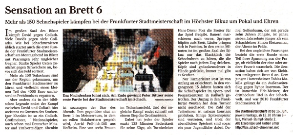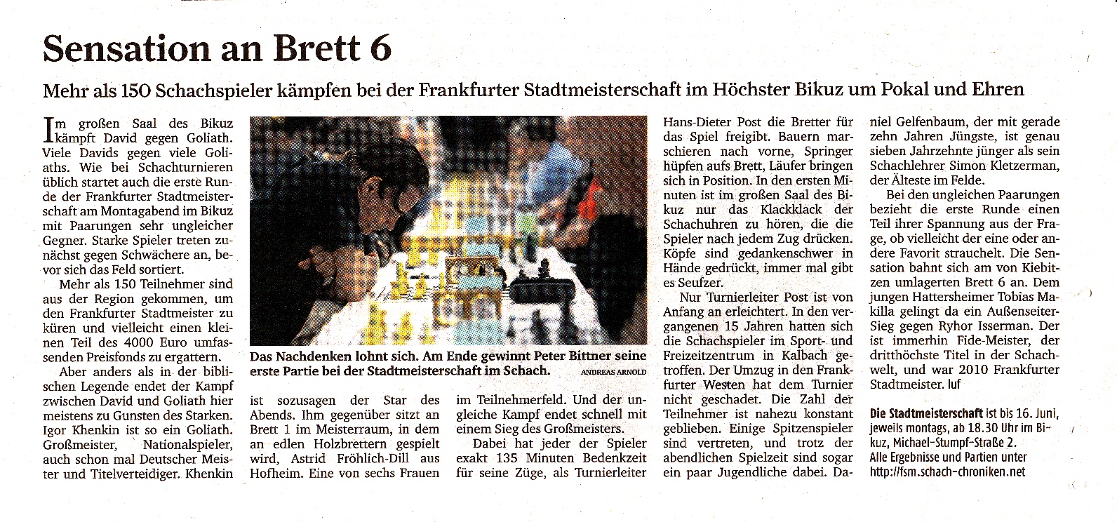Aus Bad Homburg sind 5 Spieler dabei. Die erste Runde brachte wie immer Favoriten gegen Außenseiter zusammen - und ebenfalls wie immer endeten ca. 10% der Partien nicht mit einem Sieg des Favoriten.
