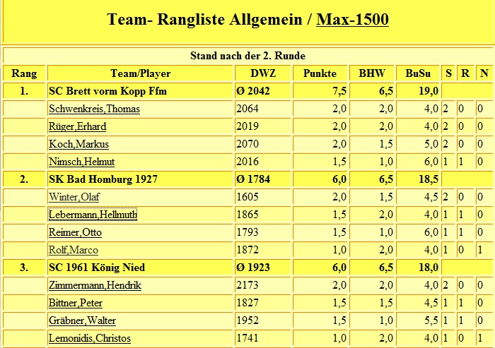 Die Team-Rangliste nach 2 Runden: Bad Homburg ist Zweiter - und das Spitzenbrett ist noch nicht mal enthalten.