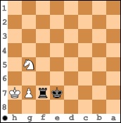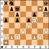 Nach einiger Zeit hatte sie dann die Diagrammstellung auf dem Brett: ihr letzter Zug war Sg5, der Gegner hätte es ganz leicht remis halten können indem er den Turm gegen den Bauern auf g7 geopfert hätte.
