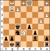 Beispielsweise hatte er in der dritten Runde mit Schwarz die Diagrammstellung auf dem Brett - eine wilde Stellung mit der Initiative bei Marco Rolf. Er zog gegen seinen Gegner mit Elo 2253 den mutigen Zug 22. ... Lh2+! - verlor aber nach einer langen Variante, beginnend mit 23. Kh1!. Wie sich im nachhinein herausstellte, hätte das verrückte (und gleichwertig aussehende, daher auch die beiden "!") 22. ... Se4! die Stellung offen gehalten - bei völlig unklarer Position.