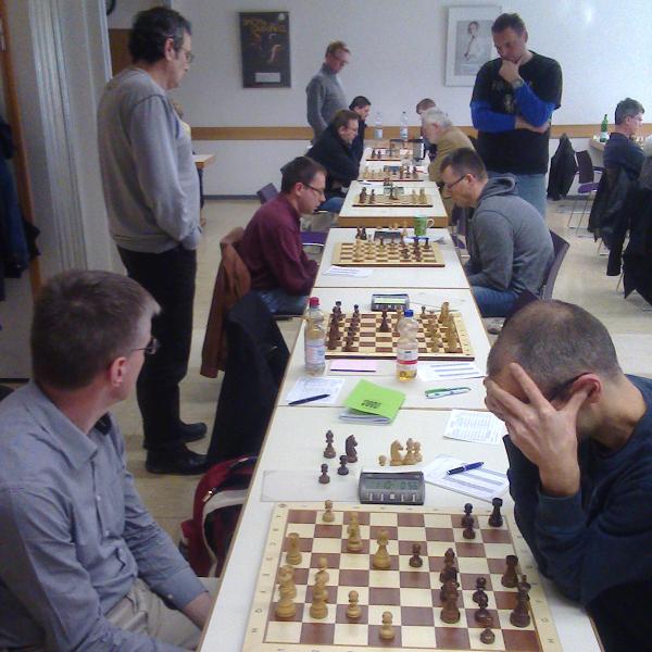 Während die Gäste auf ihr Spitzenbrett verzichten mussten, boten wir wieder 3 gute Ersatzleute für die fehlenden Positionen 3, 6 und 8. Paul Lenhart vergab rasch den Vorteil des Anziehenden und sah sich einem (fast) nicht ablehnbaren Remisangebot ausgesetzt, was er ebenso annahm wie kurz später Matthias Siegmann, der ebenfalls gute Chancen als Anziehender früh vergab. Dagegen rettete sich der Gegner von Carolin Diener mit einem Figurenopfer zu seinem Remis mittels eines Dauerschachs.