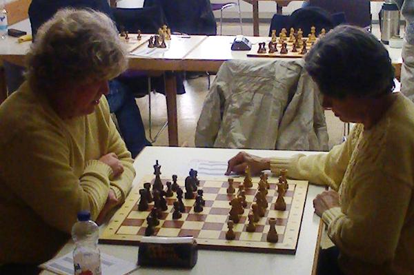 Regina Thaler (r.) in ihrem ersten Bezirksliga-Einsatz. Volles Brett, aber leider kein Punkt.