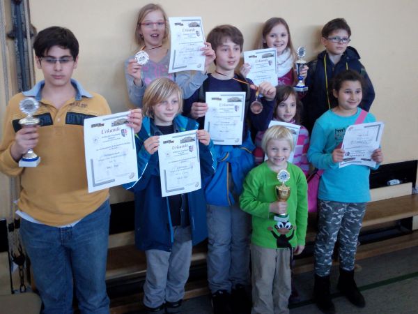 In der jüngsten Altersklasse, der WK 1. Schuljahr (wo allerdings auch Kindergartenkinder mitspielen dürfen), hatten wir Felix und Ella am Start. Für beide war es das 1. Turnier und sie durften sich gleich in der größten Gruppe unter insgesamt 40 Teilnehmern austoben. Ella fuhr souverän 3 Remis und 1 Sieg ein und konnte so einen guten Start in ihr Turnierleben verbuchen. Bei Felix lief es von Anfang an wie geschmiert, er gewann Runde nach Runde und war am Ende des Turniers mit phänomenalen 7 Punkten aus 7 Partien und 1,5 Punkten Vorsprung auf den Zweitplatzierten Turniersieger und bekam dafür den verdienten Pokal. Übrigens als einziger Turniersieger in allen Altersklassen mit blütenweißer Weste. Zudem wird er in diesem Jahr erst eingeschult und war somit einer der jüngsten Teilnehmer im ganzen Feld!