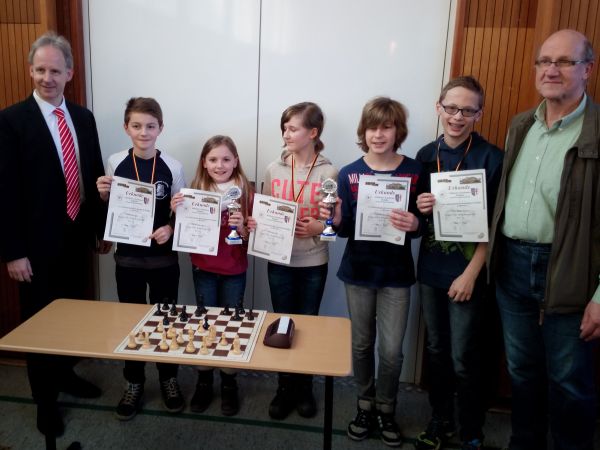 Nach einer schon recht lebhaften Anfahrt wurden erstmal intensiv die Räumlichkeiten der dortigen Wilhelm-Neuhaus-Schule inspiziert, neuerdings übrigens eine offizielle Schachschule mit Schach als Fach in jeder Grundschulklasse. Dann ging es auch schon los, insgesamt hatten sich 120 Kinder eingefunden um in ihrer jeweiligen Altersklasse ihr Schachkönnen unter Beweis zu stellen.