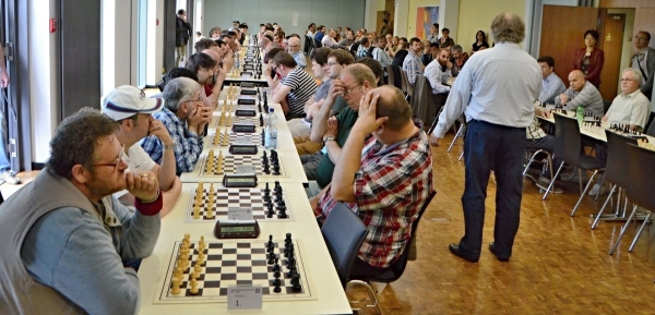 Blick in den Turniersaal. Vorn die Spitzenbretter. (Bild: GröTaz, gefunden auf http://hessische.schach-chroniken.net/hsv/20142015/hbem/fotos/thumb.html)