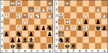 Im linken Diagramm hatte Walter Heil mit Weiß noch alle Trümpfe in der Hand und opferte korrekt mit 14. Lxh6 gxh6 15. Dxh6 eine Figur. In der Folge ergab sich ein Bauernsturm, der unaufhaltbar schien.