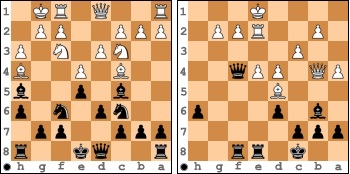 Dies brachte Fenja dann innerhalb von nur 6 Zügen zuerst eine Qualität, dann einen Läufer und in der rechten Diagrammstellung nach 32. a5? ein hübsches Matt mit der Dame auf c1 ein.