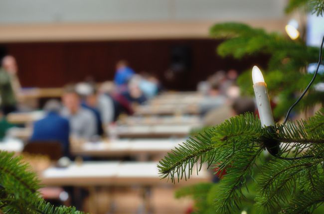 Sogar einen Weihnachtsbaum hatten sie: Turniersaal in Heusenstamm. (Foto: Hans-Dieter Post, hier mehr davon.)