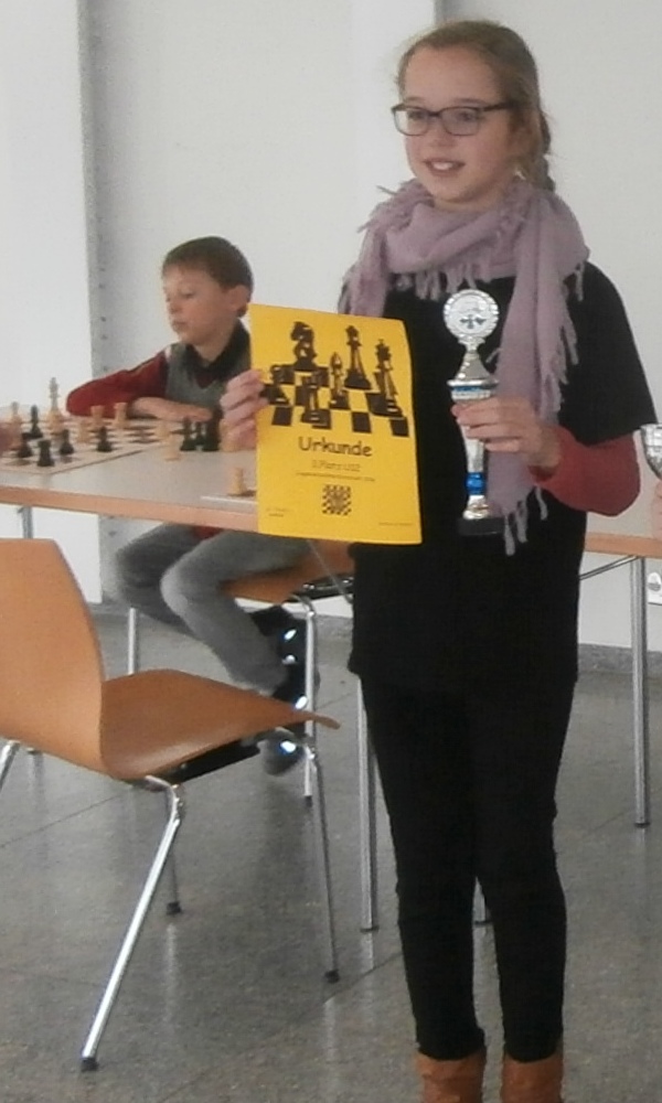 In der Altersklasse U12 traten 12 Kinder an, darunter fünf Spieler- und Spielerinnen aus Bad Homburg. Das Turnierfeld war sehr ausgeglichen und so musste am Ende der 7. Runde die Feinwertung über die Platzierung entscheiden, da drei Spieler-/innen, darunter auch Fenja Goetz, punktgleich mit jeweils 5 Punkten das Feld anführten. Aufgrund der etwas schlechteren Buchholzwertung erreichte Fenja leider "nur" Platz 3, was letztendlich jedoch eine tolle Leistung darstellt, da sie somit auch bestes Mädchen ihrer Altersklasse wurde.